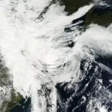 Karen quickly weakened as it moved over cooler waters,[3] and late on October 14 it degenerated back into a tropical storm as it accelerated northward.[4] Convection gradually decreased,[5] and Karen made landfall on southwestern Nova Scotia with winds of 45 mph (70 km/h) on October 15.[1] Karen retained its tropical characteristics during and after making landfall, based on a research flight out of Halifax intended to study the early stages of extratropical transition. The flight reported arced bands and a warm-core system transitioning into a more typical mid-latitude system.[6] Under the influence of a mid-latitude system, the storm turned sharply to the northeast, and after losing the remaining of its convection it became extratropical shortly after landfall. Continuing northward, the remnant low quickly weakened, and dissipated as it was absorbed by a larger extratropical storm over the Gulf of Saint Lawrence.[1]
