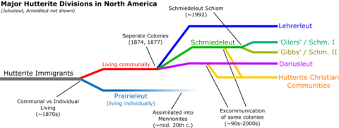 Over the next decades, the Hutterites who settled on individual farms, the so-called Prärieleut, slowly assimilated first into Mennonite groups and later into the general American population. Until about 1910 there was intermarriage between the Prärieleut and the communally living Hutterites.[34]