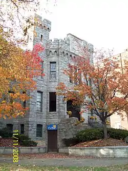 The Hyattsville Armory is a historic National Guard armory built in 1918 and located in Hyattsville, Prince George's County, Maryland, United States. It was the first Armory built in Prince George's County and the fifth in Maryland. Its architect, Robert Lawrence Harris, served as State Architect under Governor Albert C. Ritchie. In this capacity, Harris supervised the design of similar armories in Salisbury, Kensington, Silver Spring, Hagerstown, Laurel, Easton, Crisfield, Pocomoke City, Centreville, and Cumberland. The structure is distinctly fortresslike and offers a commanding view of the surrounding area. The building is patterned after a medieval English castle and built of native stone, with rectangular turrets flanking the arched limestone entranceway. Carved above the entry is the State Seal of Maryland.[2]