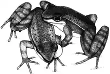 Courtship can be observed during the daytime or at night. The breeding behaviour begins with males calling near a stream, and waiting for a female to engage. Once it happens, a suitable oviposition is decided on. If the female accepts the male's offer, the latter digs up a tunnel and a chamber in the sand of the riverbed, big enough for the two frogs, in which the intercourse occurs. After oviposition, the tunnel is concealed by the male.[1]