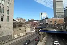 In the early 1960s, the Massachusetts Turnpike Extension was built along the Boston and Albany Railroad corridor, necessitating a major widening of that right-of-way. Routes 47 and 76 were through-routed as route 1 in September 1962 to eliminate looping at the surface station, which was permanently closed on January 21, 1963.[35]:8[21] The portion closer to Boylston Street was demolished soon after. The remaining section fronting on Newbury Street is used as an MBTA traction power substation, with two large rectifier transformers in the rear.[39] The facade is frequently covered in graffiti art and the sidewalk in front is used by buskers; the MBTA has also attempted to lease the space.[40]