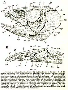 The hyomandibula, commonly referred to as hyomandibular [bone] (Latin: os hyomandibulare, from Greek: hyoeides, "upsilon-shaped" (υ), and Latin: mandibula, "jawbone") is a set of bones that is found in the hyoid region in most fishes. It usually plays a role in suspending the jaws and/or operculum (teleostomi only). It is commonly suggested that in tetrapods (land animals), the hyomandibula evolved into the columella (stapes).[1][2]