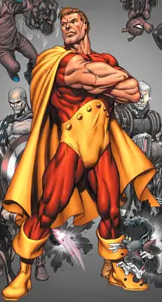 This Hyperion was sent to his reality's Earth as a baby, the only survivor of a race of Eternals from a dying world. He was raised by a man named "Father", who named him Marcus Milton and taught him the morals of society. As an adult, he became the superhero named Hyperion and protected the world alongside the Squadron Supreme. When his reality collided with another, Hyperion was the only survivor, floating around in the void that had been his universe until a group of A.I.M. scientists pulled him into the Earth-616 reality. Hyperion was in the captivity of A.I.M. until he was freed by the Avengers and offered a place amongst them.[42] Hyperion is among the superheroes that joined the Avengers due to the threat of Ex Nihilo on Mars.[43] Hyperion was with the Avengers when A.I.M. was sighted in the Savage Land trying to extract the formula from one of the Garden's evolution pods.[42] Hyperion later joins the Earth-616 version of the Squadron Supreme along with other various heroes who survived their home realities' destruction. This new incarnation of the Squadron Supreme are more dangerous than the Earth-712 and Supreme Power versions as they swear to protect Earth by any means necessary. Their first public battle is the destruction of Atlantis which Hyperion enacts himself as well as severing Namor's head with his atomic vision, killing him instantly in retaliation for the King of Atlantis' role in the annihilation of Doctor Spectrum's home reality. After the public death of Namor the Squadron Supreme become a very controversial team which puts them at odds with the Avengers. Hyperion is convinced to take on a secret identity and later decides to take a job as a truck driver.[44]