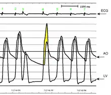 The Brockenbrough–Braunwald–Morrow sign is observed in individuals with HCM with outflow tract gradient. This sign can be used to differentiate HCM from aortic stenosis. In individuals with aortic stenosis, after a premature ventricular contraction (PVC), the following ventricular contraction will be more forceful, and the pressure generated in the left ventricle will be higher. Because of the fixed obstruction that the stenotic aortic valve represents, the post-PVC ascending aortic pressure will increase as well. In individuals with HCM, however, the degree of obstruction will increase more than the force of contraction will increase in the post-PVC beat. The result of this is that the left ventricular pressure increases and the ascending aortic pressure decreases, with an increase in the LVOT gradient.