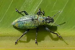 | Hypomeces squamosus from Laos on a green leaf. | |