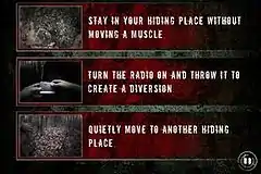 When the player is presented with a choice, the game cuts to a decision tree, where the player selects their choice. The game then moves on to the next segment, and the player can see if they selected the correct choice. Choices involve, for example, choosing to take the left or right path, or choosing to remain hidden or run away. However, the game script is fixed, different choices do not lead to a branching narrative - if the player makes the wrong choice (choosing to remain hidden instead of fleeing, for example), the player will die and the game will end, with a text description of how the player has died. At this point, the game can jump back anywhere between one and three choices.