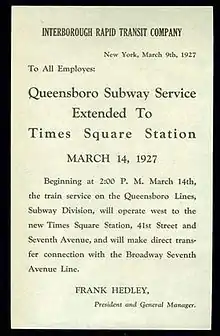 - "New Queens Subway Opened to Times Sq" (PDF). New York Times. March 15, 1927. p. 1. Retrieved October 2, 2011.