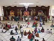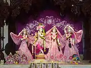 In the temple hall, there are three teak-wood altars which house the deities of Lord Krishna with His consort Radharani and their assisting friends Lalita and Vishaka, Lord Chaitanya with Lord Nityananda and Lord Jagannath, Baladeva and Subhadra.[5] These deities have been sourced from Jaipur and Orissa. Designed under the guidance of Sri Bhanu Swami, the temple has imbibed various attributes from Vedic scripture and is inspired by the Pallava and Kalinga architecture.[1]