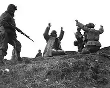 In September, the UN Forces launched another counteroffensive with the 24th Infantry Division at the center of the line, west of the Hwachon Reservoir. Subsequently, three of I Corps divisions advanced behind the 24th Infantry Division in Operation Commando.[43] Flanked by the ROK 2nd and 6th Divisions, the 24th advanced past Kumwha, engaging the PVA20th and 27th Armies.[43] These attacks were fierce, though PVA resistance was not as strong as it had been in previous offensives.[44] In November, the PVA attempted to counter this attack, but were unsuccessful. It was at this point, after several successive counteroffensives that saw both sides fighting intensely over the same ground, that the two sides started serious peace negotiations.[45] In January 1952, IX Corps was again reorganized, now containing the 7th Infantry Division and the newly arrived 45th Infantry Division. Two months later, it was reorganized with the 2nd Infantry Division, the 40th Infantry Division, and the ROK 2nd, 3rd and Capital Divisions.[16]