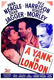 I Live in Grosvenor Square is a British comedy-drama romance war film directed and produced by Herbert Wilcox. It was the first of Wilcox's "London films" collaboration with his wife, actress Anna Neagle. Her co-stars were Dean Jagger and Rex Harrison. The plot is set in a context of US-British wartime co-operation, and displays icons of popular music with the purpose of harmonising relationships on both sides of the Atlantic.[2] An edited version was distributed in the United States, with two additional scenes filmed in Hollywood, under the title A Yank in London.