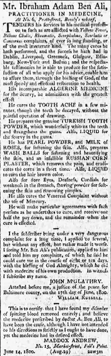 In America as Mr. Ibraham Adam Ben Ali, he set up practice as a physician in Boston, where he advertised patent medicines in late 1794,[8] followed by stints in New York City from 1795,[9] Philadelphia in 1799,[10] and Baltimore in 1800.[11] He married a Baptist[5] Englishwoman,[7] having by her a sole daughter, Adeline, who became wife of Terah Temple Haggin and mother of multi-millionaire lawyer and investor James Ben Ali Haggin (1822 – 1914).[7][2][3] In 1800, he died of a yellow fever outbreak that hit Philadelphia and Baltimore.[7]