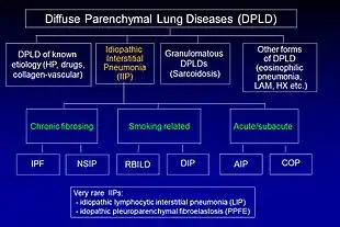 Idiopathic pulmonary fibrosis (IPF) belongs to a large group of more than 200 lung diseases known as interstitial lung diseases (ILDs), which are characterized by the involvement of the lung interstitium,[7] the tissue between the air sacs of the lung. IPF is one specific presentation of idiopathic interstitial pneumonia (IIP), which is in turn a type of ILD, also known as diffuse parenchymal lung disease (DPLD).