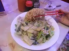I fu mie or yi fu mein is an Indonesian crispy deep fried thick noodle dish, popular in Maritime Southeast Asia, served in a thick savoury sauce with pieces of meat or seafood and vegetables. The dishes are to be served hot while the noodles are still crisp until the noodles are softened by the sauce and are ready to be eaten. The dish is one of the most popular noodle dishes in Chinese Indonesian cuisine.[1] The type of noodle being used in this dish is the thick yi mein noodle, hence the origin of its name. It is quite similar to mie kering noodles from Makassar.