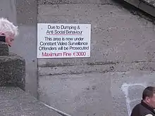 Increasing offenders’ risk of getting caught is also a way to combat illegal dumping. The most common way to accomplish this is through surveillance measures, such as video cameras. Camera footage can help law enforcement officials identify dumpers while also collecting data on peak dumping periods. Installation of fake cameras has also been shown to be a deterrent. Police patrols, helicopter and plane surveillance, and community surveillance are also options for increasing risk. Police presence generally deters illegal activity, while community surveillance depends upon residents reporting known illegal dumpers to law enforcement for a monetary reward.[13] The cities of Los Angeles, Sacramento, and Oakland all implement similar reporting schemes.[14][15][16]