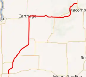 IL 336 bypasses Carthage to the south and east, with a full interchange (US 136) east of Carthage. The highway turns east and overlaps US 136 east of Carthage toward Macomb. Highway bridges over two branches of the LaMoine River as well as an overpass for the BNSF Railway and IL 61 carry the highway east with new alignments south of both Tennessee and Colchester.