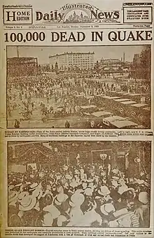 ![]() First day's edition of the Illustrated Daily News, September 3, 1923, reporting on the Great Kantō earthquake in Japan | |