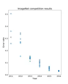 The resulting annual competition is now known as the ImageNet Large Scale Visual Recognition Challenge (ILSVRC). The ILSVRC uses a "trimmed" list of only 1000 image categories or "classes", including 90 of the 120 dog breeds classified by the full ImageNet schema.[6] The 2010s saw dramatic progress in image processing. Around 2011, a good ILSVRC classification top-5 error rate was 25%. In 2012, a deep convolutional neural net called AlexNet achieved 16%; in the next couple of years, top-5 error rates fell to a few percent.[15] While the 2012 breakthrough "combined pieces that were all there before", the dramatic quantitative improvement marked the start of an industry-wide artificial intelligence boom.[4] By 2015, researchers at Microsoft reported that their CNNs exceeded human ability at the narrow ILSVRC tasks.[10][16] However, as one of the challenge's organizers, Olga Russakovsky, pointed out in 2015, the programs only have to identify images as belonging to one of a thousand categories; humans can recognize a larger number of categories, and also (unlike the programs) can judge the context of an image.[17]