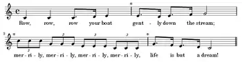 When a phrase recurs exactly as before (except perhaps transposed), it is called strict imitation. A round is thus an example of strict imitation. Repetition is defined as the repetition of a phrase or melody often with variations in key, rhythm, and voice.
