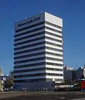 The building was first operated as the Christchurch studio for Television New Zealand (TVNZ), who displayed their logo on the building. Shows such as What Now,[6] After School,[7] Simon Barnett's quiz show Face the Music and later The Son of a Gunn Show[8] were filmed in the tower block. TVNZ vacated the building in late 1998 following a decision to move all of their Christchurch-produced shows to Wellington. In the late 1990s, Telstra New Zealand, the telecommunications company of Telstra in New Zealand, owned the naming rights to the building. After Clear Communications was acquired in December 2001 to form TelstraClear, the Clear logo was prominently displayed on the building.[9][10] The building's naming rights were sold to The Radio Network and it was renamed to Radio Network House during the ownership of Nor West Arch No.4 Ltd. At the time of demolition the logo of Newstalk ZB, a subsidiary of The Radio Network, was displayed on the building.[4]