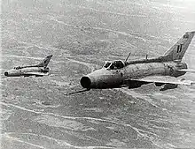Within the first two weeks, the IAF had carried out almost 12,000 sorties over East Pakistan and also provided close air support to the advancing Indian Army.[53] IAF also assisted the Indian Navy in its operations against the Pakistani Navy and Maritime Security Agency in the Bay of Bengal and Arabian Sea. On the western front, the IAF destroyed more than 20 Pakistani tanks,[54] 4 APCs and a supply train during the Battle of Longewala.[55] The IAF undertook strategic bombing of West Pakistan by carrying out raids on oil installations in Karachi, the Mangla Dam and a gas plant in Sindh.[56] Similar strategy was also deployed in East Pakistan and as the IAF achieved complete air superiority on the eastern front, the ordnance factories, runways, and other vital areas of East Pakistan were severely damaged.[57] By the time Pakistani forces surrendered, the IAF destroyed 94 PAF Aircraft[58] The IAF was able to conduct a wide range of missions – troop support; air combat; deep penetration strikes; para-dropping behind enemy lines; feints to draw enemy fighters away from the actual target; bombing; and reconnaissance. In contrast, the Pakistan Air Force, which was solely focused on air combat, was blown out of the subcontinent's skies within the first week of the war. Those PAF aircraft that survived took refuge at Iranian air bases or in concrete bunkers, refusing to offer a fight.[59] Hostilities officially ended at 14:30 GMT on 17 December, after the fall of Dacca on 15 December. India claimed large gains of territory in West Pakistan (although pre-war boundaries were recognised after the war), and the independence of Pakistan's East wing as Bangladesh was confirmed. The IAF had flown over 16,000 sorties[53] on both East and West fronts; including sorties by transport aircraft and helicopters.[53] while the PAF flew about 30 and 2,840. More than 80 per cent of the IAF's sorties were close-support and interdiction, and according to neutral assessments about 45 IAF Aircraft were lost while, Pakistan lost 75 aircraft.[60] Not including any F-6s, Mirage IIIs, or the six Jordanian F-104s which failed to return to their donors. But the imbalance in air losses was explained by the IAF's considerably higher sortie rate, and its emphasis on ground-attack missions. On the ground Pakistan suffered most, with 9,000 killed and 25,000 wounded while India lost 3,000 dead and 12,000 wounded. The loss of armoured vehicles was similarly imbalanced. This represented a major defeat for Pakistan.[61] Towards the end of the war, IAF's transport planes dropped leaflets over Dhaka urging the Pakistani forces to surrender, demoralising Pakistani troops in East Pakistan.[62]