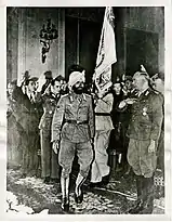 The Indian Legion was organised as a standard German army infantry regiment of three battalions of four companies each, at least initially with exclusively German commissioned officers. It has been later referred to as Panzergrenadier Regiment 950 (indische), indicating the unit was partially motorised.[23] It was equipped with 81 motor vehicles and 700 horses.[24] In this structure, the legion came to consist of: