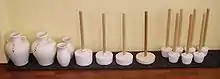 Indian clubs, which originated in the Indian subcontinent,[1][2] are a type of exercise equipment used to present resistance in movement to develop strength and mobility. They consist of bowling-pin shaped wooden clubs of varying sizes and weights, which are swung in certain patterns as part of a strength exercise program. They can range in weight from a few pounds each to special clubs that can weigh as much as up to 100 pounds. They were used in carefully choreographed routines in which the clubs were swung in unison by a group of exercisers, led by an instructor, similar to 21st-century aerobics or zumba classes. The routines would vary according to the group's ability along with the weights of the clubs being used. When the 19th-century British colonists came across exercising clubs in India, they named them Indian clubs.