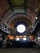 The station was placed on the National Register of Historic Places on July 14, 1982.[2] Beginning in 1984, the facility was renovated and converted from its primary use as a railroad station to a festival marketplace. The Indianapolis architecture firm of Woollen, Molzan and Partners was responsible for the restoration of the station's historic shed, which reopened in 1986.[17] Union Station became a collection of restaurants, nightclubs, and specialty stores that included an NBC Store and a model train retailer. The eastern end of the former train platform area featured a large food court, plus several self-contained bars and nightclubs. Statues of individuals who might have been seen in the railroad station in prior years were installed throughout the facility. The 273-room Crowne Plaza Hotel took up much of the western portion of the train shed, with 26 of its rooms being housed within thirteen old Pullman cars.[18]