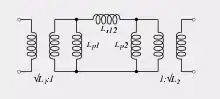 Alternatively, two coupled inductors can be modelled using a π equivalent circuit with optional ideal transformers at each port. While the circuit is more complicated than a T-circuit, it can be generalized[28] to circuits consisting of more than two coupled inductors. Equivalent circuit elements , have physical meaning, modelling respectively magnetic reluctances of coupling paths and magnetic reluctances of leakage paths. For example, electric currents flowing through these elements correspond to coupling and leakage magnetic fluxes. Ideal transformers normalize all self-inductances to 1 Henry to simplify mathematical formulas.