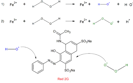 The Fenton process utilizes iron catalysts with H2O2 to create powerful, oxidizing hydroxides for the degradation of organic pollutants such as sewage and sludge as well as dyes. To enhance the catalytic abilities, a combination of Fe2+ cations, ultraviolet light, and hydrogen peroxide can be used and has shown greater removals of dye solutions.[8]