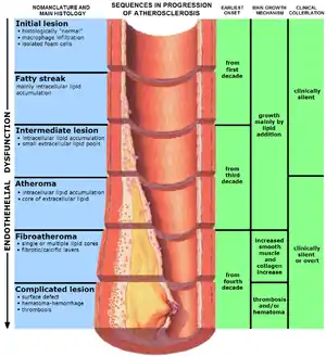 - Heart: Myocardial infarction (MI), commonly known as a heart attack, is an infarction of the heart, causing some heart cells to die. This is most commonly due to occlusion (blockage) of a coronary artery following the rupture of a vulnerable atherosclerotic plaque, which is an unstable collection of lipids (fatty acids) and white blood cells (especially macrophages) in the wall of an artery. The resulting ischemia (restriction in blood supply) and oxygen shortage, if left untreated for a sufficient period of time, can cause damage or kill heart muscle tissue (myocardium).