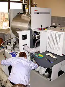 Photodissociation is used to detect electromagnetic activity of ions, compounds, and clusters when spectroscopy cannot be directly applied. Low concentrations of analyte can be one inhibiting factor to spectroscopy esp. in the gas phase.[4] Mass spectrometers, time-of-flight and ion cyclotron resonance have been used to study hydrated ion clusters.[10] Instruments are able to use ESI to effectively form hydrated ion clusters. Laser ablation and corona discharge have also been used to form ion clusters. Complexes are directed through a mass spectrometer where they are irradiated with infrared light, Nd:YAG laser.[10]