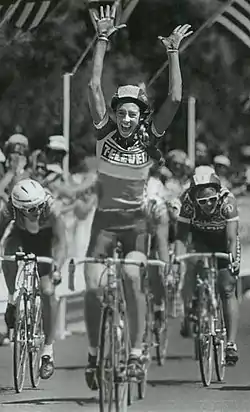 ![]() Thompson winning the road race at the 1988 Olympic trials | |