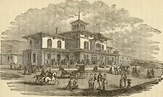 Completed in 1868, the hotel cost Mr. Davis a total of $162,000 (approximated $3.6 million in 2016 US Dollars), but following the Panic of 1873 was sold at auction to one N.S. Chandler "for a little less than $30,000".[8] The hotel, which featured a farm, telegram station, gasworks, and railway stop, was short-lived however, and closed in the winter of 1874 due to low attendance in the midst of an economic depression.[10] The hotel was razed by fire on July 25, 1875, with some indication that the blaze "was the work of an incendiary".[11][12] The hotel and its contents were insured in total for $20,000.[13] Though the hotel itself stood on the shores of the Connecticut for less than a decade, the Ingleside name would persist as that of the surrounding area long after its absence.[14]