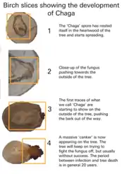 I. obliquus causes a white heart rot to develop in the host tree. The chaga spores enter the tree through wounds, particularly poorly healed branch stubs. The white rot decay will spread throughout the heartwood of the host. During the infection cycle, penetration of the sapwood occurs only around the sterile exterior mycelium mass.[4] The chaga fungus will continue to cause decay within the living tree for 10–80+ years. While the tree is alive, only sterile mycelial masses are produced (the black exterior conk). The sexual stage begins after the tree, or some portion of the tree, is killed by the infection. I. obliquus will begin to produce fertile fruiting bodies underneath the bark. These bodies begin as a whitish mass that turn to brown with time. Since the sexual stage occurs almost entirely under the bark, the fruiting body is rarely seen.[5] These fruiting bodies produce basidiospores which will spread the infection to other vulnerable trees.