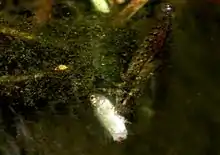 The role of the labium in some insects however, is adapted to special functions; perhaps the most dramatic example is in the jaws of the nymphs of the Odonata, the dragonflies and damselflies. In these insects, the labium folds neatly beneath the head and thorax, but the insect can flick it out to snatch prey and bear it back to the head, where the chewing mouthparts can demolish it and swallow the particles.[2]