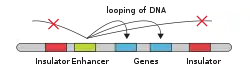 Insulators function either as an enhancer-blocker or a barrier, or both. The mechanisms by which an insulator performs these two functions include loop formation and nucleosome modifications.[3][4] There are many examples of insulators, including the CTCF insulator, the gypsy insulator, and the β-globin locus. The CTCF insulator is especially important in vertebrates, while the gypsy insulator is implicated in Drosophila. The β-globin locus was first studied in chicken and then in humans for its insulator activity, both of which utilize CTCF.[5]