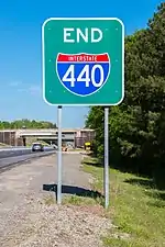 The original I-440 designation used "inner" and "outer" labels rather than east and west labels because the freeway made a full loop around the city. "Inner" was used to designate the clockwise direction around the beltline, and "outer" was used to designate counterclockwise.[31] In 2008, State Highway Administrator W. F. Rosser asked the US Department of Transportation to remove the I-440 designation from the southern portion of the beltline, where it was cosigned with I-40. This decision was primarily made to prevent confusion of travelers who used the highway. On November 10, 2008, I-440 was officially truncated on the western end at the I-40/US 1/US 64 interchange in western Raleigh and at the I-40 interchange in southeast Raleigh. The inner and outer labels were also dropped and replaced with east and west designations.[32][33] The Federal Highway Administration route log has been updated to show the shortened distance.[1] By 2010, the entirety of the highway's signs had been changed to the new designation.[34]