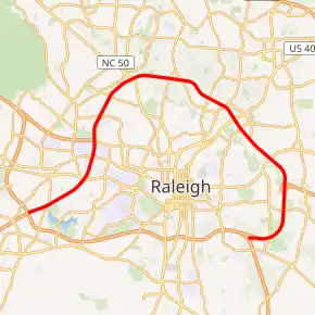 The route remained unchanged until September 1972, when US 70/NC 50 was relocated from its routing along Glenwood Avenue and placed along the beltline from the Glenwood Avenue exit to North Boulevard, where the two roads then turned to the south and followed US 401 into downtown Raleigh.[16] In 1975, construction began on a new extension of the beltline, which was to run from New Bern Avenue southwest to Hammond Road in south Raleigh.[17][18] By 1976, construction had been extended west to US 70/US 401/NC 50 (South Saunders Street).[18][19] The first leg of the new construction was opened later that year, prolonging the freeway south to Poole Road.[19][20] In April 1984, the construction of the beltline along the south side of Raleigh was completed. US 70/US 401/NC 50 was rerouted from Downtown Boulevard (formerly North Boulevard, now called Capital Boulevard) along the east side of the beltline to South Saunders Street, where both routes followed the road south toward Garner. The route change left the former routings through downtown Raleigh as secondary roads. US 64 was removed from the northern side of the beltline and placed along the new southern side, from US 1 near Cary to New Bern Avenue. Interstate 40 was rerouted from present-day Wade Avenue and along the new construction before ending at US 1.[21]
