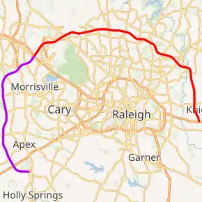 | Southern Wake Freeway (not yet built) | NC 540 | NC 55 to I-40 near Garner | 16.5 |