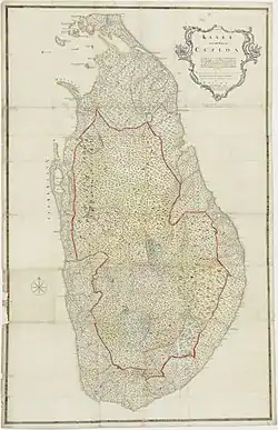 News of the conflict took some months to reach the East Indies, where British and French naval forces had fought an inconclusive campaign for control of the Indian Ocean trade routes since 1793. British forces, supporting those of the East India Company, were principally operating from Madras and Calcutta in India, the French from their island bases of Île de France (now Mauritius) and Réunion.[3] Following an inconclusive engagement off Île Ronde on 22 October 1794, the French squadron on Île de France had remained under blockade at Port Louis and thus most of the British naval forces in the East Indies were available for the campaign against the Batavian territories.[4] Dutch colonisation of Ceylon did not span the whole island, which was mostly ruled by the interior Kingdom of Kandy. European settlement was instead concentrated at coastal strips surrounding the significant ports of Colombo on the west coast and Trincomalee on the east, supplemented by smaller trading factories and settlements elsewhere.[5] Trincomalee was particularly important as raiding forces based in the port could easily strike against British trade routes in the Bay of Bengal, but the port had limited food supplies, poorly-developed facilities and a small garrison.[5]