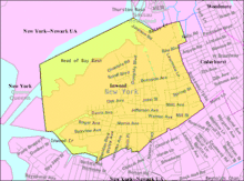 Inwood is included among the Five Towns, an informal grouping of villages and hamlets in Nassau County on the South Shore of western Long Island adjoining the border with Queens County in New York City. Despite the name, none of the communities are towns. In addition to Inwood, the Five Towns is usually said to be composed of the villages of Lawrence and Cedarhurst, the hamlet of Woodmere, and "The Hewletts", which consist of the villages of Hewlett Bay Park, Hewlett Harbor and Hewlett Neck and the hamlet of Hewlett, along with Woodsburgh.[1] The "towns" most commonly included as constituents of the "Five Towns" are all within the Town of Hempstead. Inwood is represented as part of the Town's 3rd District by Councilman Bruce A. Blakeman.