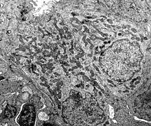 Marine teleost fishes consume large quantities of seawater to reduce osmotic dehydration.[7] The excess of ions absorbed from seawater is pumped out of the teleost fishes via the ionocytes.[7] These cells use active transport on the basolateral (internal) surface to accumulate chloride, which then diffuses out of the apical (external) surface and into the surrounding environment.[8] Such mitochondrion-rich cells are found in both the gill lamellae and filaments of teleost fish. Using a similar mechanism, freshwater teleost fish use these cells to take in salt from their dilute environment to prevent hyponatremia from water diffusing into the fish.[8] In the context of freshwater fish, ionocytes are often referred to as "mitochondria-rich cells", to emphasis their high density of mitochondria.[9]