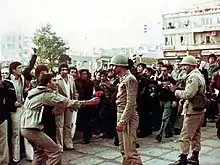 On 18 February, 40 days after Qom clashes, demonstrations broke out in various different cities.[104] The largest was in Tabriz, which descended into a full-scale riot. "Western" and government symbols such as cinemas, bars, state-owned banks, and police stations were set ablaze.[100] Units of Imperial Iranian Army were deployed to the city to restore order, and the death toll, according to government was 6,[105] while Khomeini claimed hundreds were "martyred."[5][22][93][106]