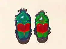 Ischiopsopha jamesii can reach a length of about 32 mm.[2] These beetles have an electric green and blue colour with a red-orange transversal band in the middle of elytra. They have the tip of the scutellum visible.