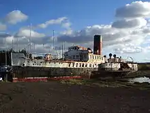 The Medway Queen fell into a state of severe dilapidation, but was bought in September 1977 by a trio of Kent businessmen for £10,000.[27] When they tried to move her out of the marina, she sank just outside in the River Medina. There she remained until 1984, when she was refloated and taken to Chatham in Kent.[28] After many years of uncertainty, she is now owned by the Medway Queen Preservation Society and is currently undergoing full restoration at Gillingham Pier.