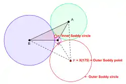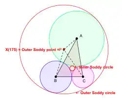 Given a triangle ABC one can draw circles in the plane of triangle ABC with centers at A, B, and C such that they are tangent to each other externally. In general, one can draw two new circles such that each of them is tangential to the three circles with A, B, C as centers. (One of the circles may degenerate into a straight line.) These circles are the Soddy circles of the triangle ABC. The circle with the smaller radius is the inner Soddy circle and its center is called the inner Soddy point or inner Soddy center of triangle ABC. The circle with the larger radius is the outer Soddy circle and its center is called the outer Soddy point or outer Soddy center of triangle ABC. [6][7]