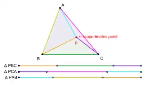 In geometry, the isoperimetric point is a special point associated with a plane triangle. The term was originally introduced by G.R. Veldkamp in a paper published in the American Mathematical Monthly in 1985 to denote a point P in the plane of a triangle ABC having the property that the triangles PBC, PCA and PAB have isoperimeters, that is, having the property that[1][2]
