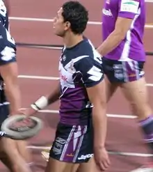 Folau was just 17 years of age when he made his debut in the 2007 NRL season. His debut came earlier than his coach Craig Bellamy intended, and he was named as a replacement on the right wing for injured Steve Turner. He started in the side's first match of the 2007 NRL season, against the Wests Tigers, and became the youngest player ever to play for the Storm.[21] In his first game, he scored the match-winning try to help Melbourne beat the Tigers 18–16. After such a solid performance in his opening game, and an injury-free year, Folau went on to play in every match of the season, the only player to do so for Melbourne in 2007. Playing superbly on the wing, coach Craig Bellamy brought Folau in to play in the centres from time to time, where he would receive more ball and have more opportunity to score points. After 26 rounds Folau finished the regular season with 21 tries and 5 goals for a total of 94 career points. His try tally (21) saw him the equal top-try scorer for the 2007 regular season alongside North Queensland Cowboys full-back Matt Bowen.[22]