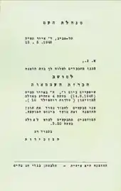 When Herzl Rosenblum, a journalist, was called up to sign, Ben-Gurion instructed him to sign under the name Herzl Vardi, his pen name, as he wanted more Hebrew names on the document. Although Rosenblum acquiesced to Ben-Gurion's request and legally changed his name to Vardi, he later admitted to regretting not signing as Rosenblum.[14] Several other signatories later Hebraised their names, including Meir Argov (Grabovsky), Peretz Bernstein (then Fritz Bernstein), Avraham Granot (Granovsky), Avraham Nissan (Katznelson), Moshe Kol (Kolodny), Yehuda Leib Maimon (Fishman), Golda Meir (Meyerson/Myerson), Pinchas Rosen (Felix Rosenblueth) and Moshe Sharett (Shertok). Other signatories added their own touches, including Saadia Kobashi who added the phrase "HaLevy", referring to the tribe of Levi.[20]