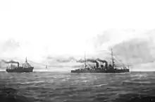 In 1902–1903, Liguria was in the main Italian fleet; while in their normal peacetime training routine, the ships of the main fleet were kept in commission for exercises for seven months of the year. For the remaining five months, they were kept in a partial state of readiness with reduced crews.[6][7] The ship was assigned to the American Station in 1904, the sole Italian warship in the region.[8] In late 1906, the ship took part in experiments with coaling while underway. She towed the collier SS Sterope at a speed of 12 knots (22 km/h; 14 mph) while coal was transferred via the towing cable. An average of 60 t (59 long tons; 66 short tons) of coal was transferred per hour during the test.[9] Starting in 1908, Liguria was modified to operate an observation balloon. This service, which lasted until 1911, involved towing a "draken" balloon—invented by the Germans August von Parseval and Rudolf von Sigsfeld—to spot naval mines for the fleet.[10][11]